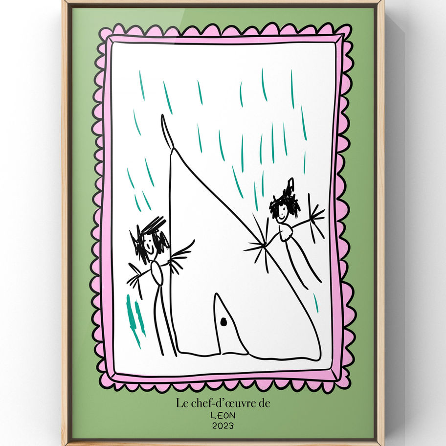 Une illustration personnalisée pour afficher fièrement le plus beau dessin de mini sur le mur de manière esthétique et colorée. Dites Adieu aux feuilles qui prennent la poussière sur le frigo et conservez de précieux souvenirs de votre enfant.